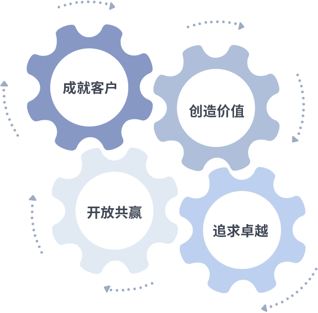 成就客户是一切决策的出发点,,,,创造价值是衡量所有工作的标准,,,追求卓越是我们做事做人的态度,,,开放共赢是我们的格局也是最终的结果。。。。价值观的齿轮环环相扣,,推动着组织里的每个人不断向前。。。