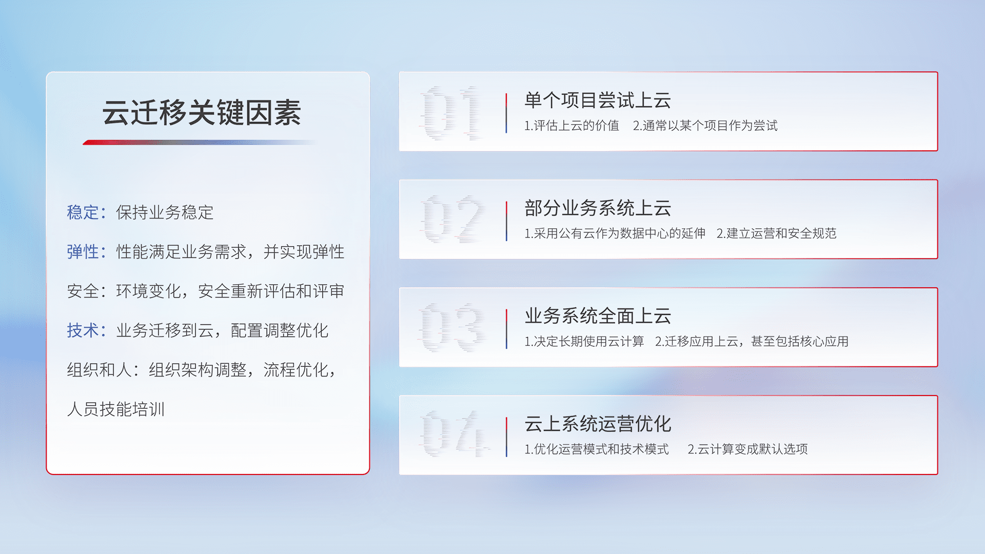 结合实际业务,,,从规划设计、、、云平台选型、、、、云原生改造、、、数据迁移、、、、集成交付,,,迁移全过程为客户识别最佳上云路径,,,做好风险识别管理,,设计网络架构、、、身份权限、、、安全审计合规、、、、操作审计、、日志审计、、监控告警策略、、、、多站点容灾设计等,,对云上基础设施进行整体规划,,提升IT治理水平,,,以满足弹性、、、高可用、、、、高性能的需求。。。。