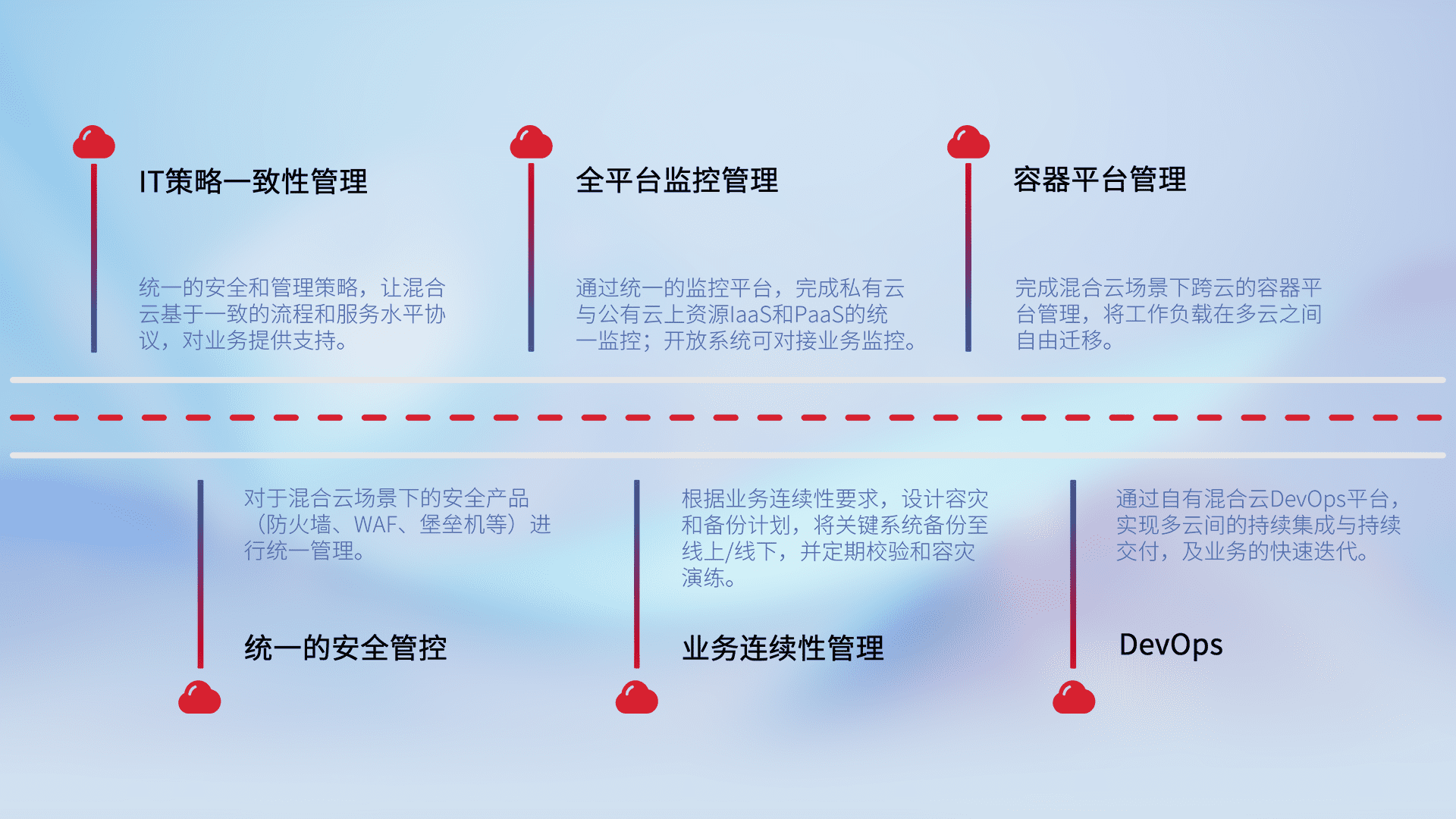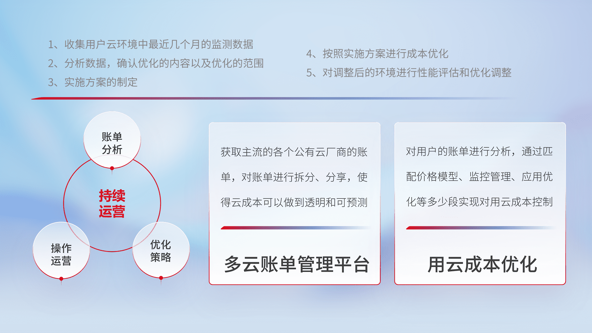 通过多云纳管,,以统一的资源数据模型把客户的云资源进行抽象和封装,,进而实现对多云资源的统一操作,,保障云资源管理的可靠性、、稳定性与可用性。。。。量身定制化运维内容,,,,配置、、开发运维、、、、补丁管理、、、、备份、、、、监控、、、、认证和访问管理、、、审计和日常巡检等,,保障在用云过程中的可靠度,,稳定度以及高可用率。。。。