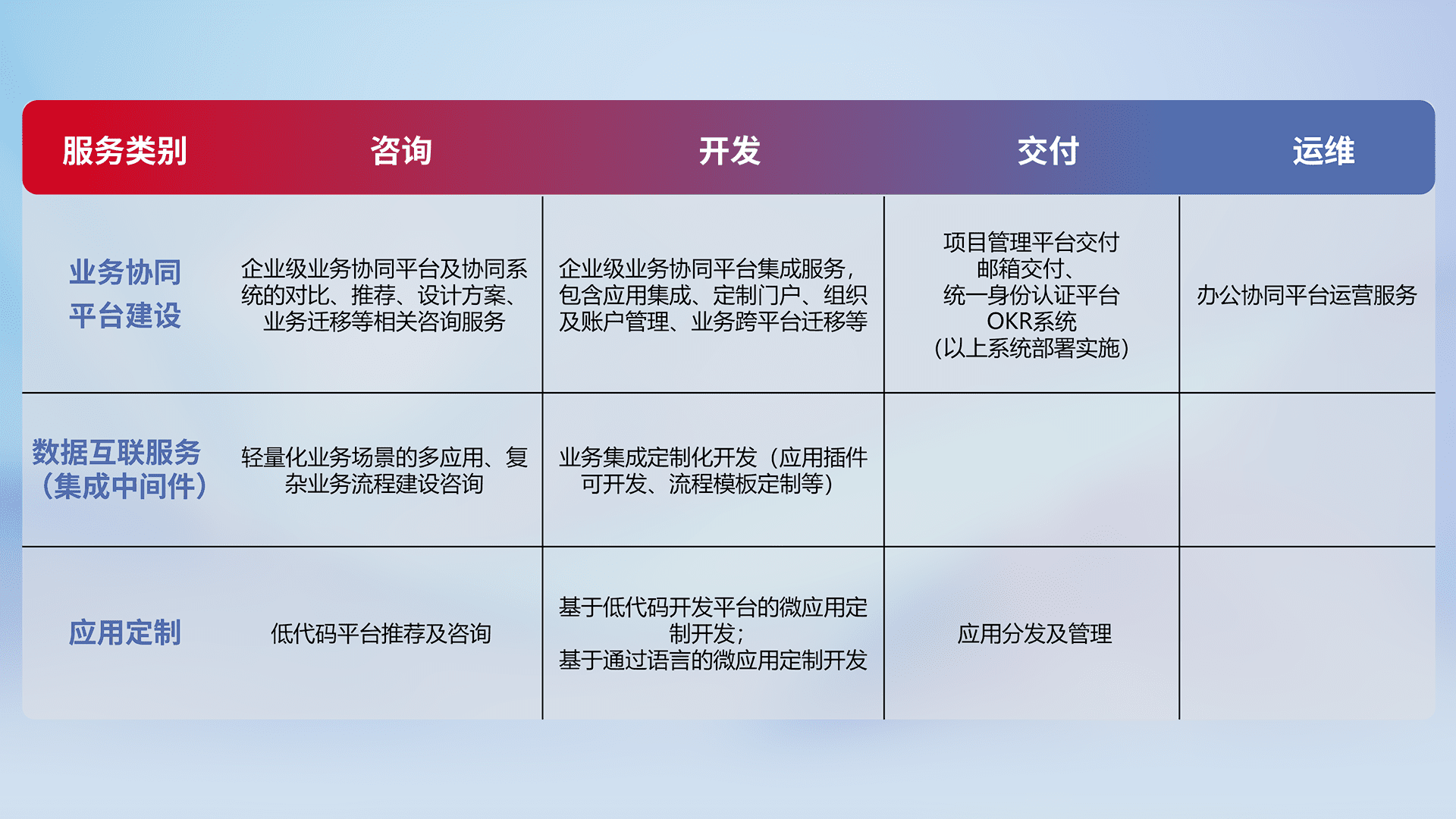 针对钉钉、、、企微、、、IDaas等平台级产品提供产品的规划、、方案、、、交付、、、定制化开发等服务,,,,实现如统一协同办公、、智能客户服务、、、、混合会议管理、、、、智能数据查询、、、、等业务场景,,,,实现数字化转型。。。